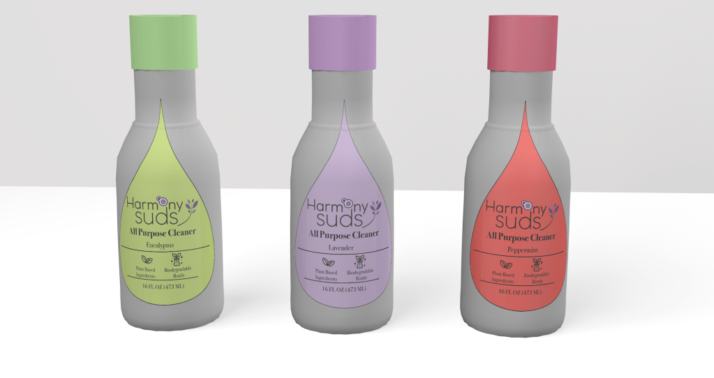 The concept of this project was to create branding and packaging for a new liquid product. After researching existing cleaning products, I decided to make an all-purpose cleaning spray that contained essential oils as a major component in all of the products. I brainstormed several name variations and chose the name “Harmony Suds” because I felt it fit my brand image the best. I wanted customers who use this line of products to feel relaxed when cleaning using Harmony Suds.